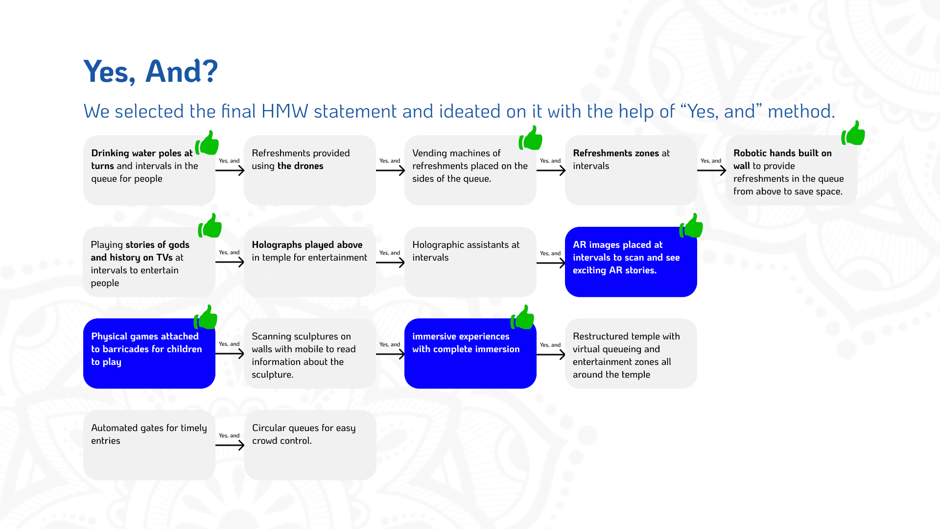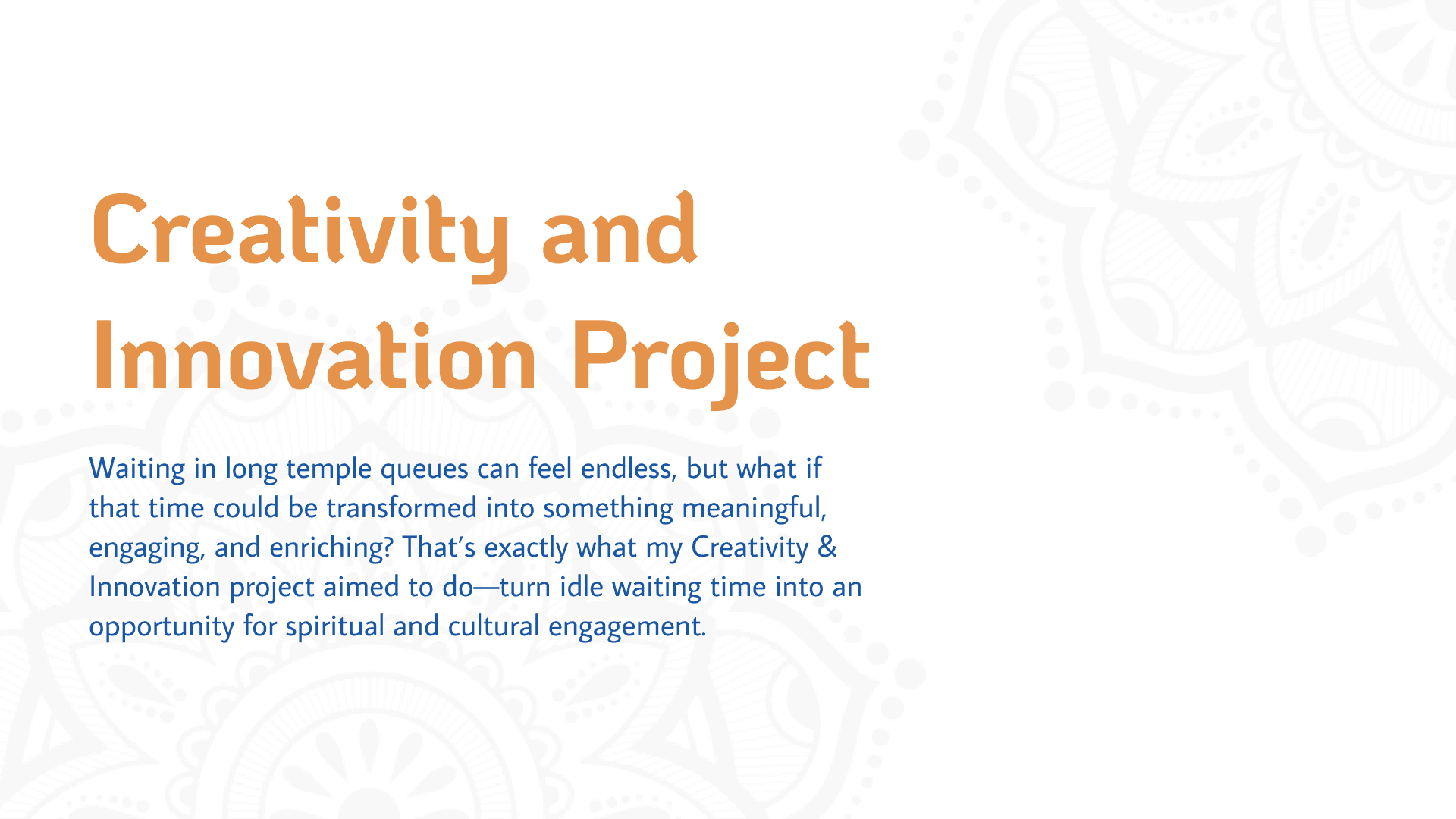 The Creativity & Innovation Project focused on improving the experience of waiting in long temple queues, which are often exhausting and monotonous for devotees. Beginning with observations of a temple setting, the team analyzed user activities, environments, objects, and interactions using the AEIOU framework. From these observations, key questions were raised around crowd management, visitor comfort, architectural significance, and user engagement.